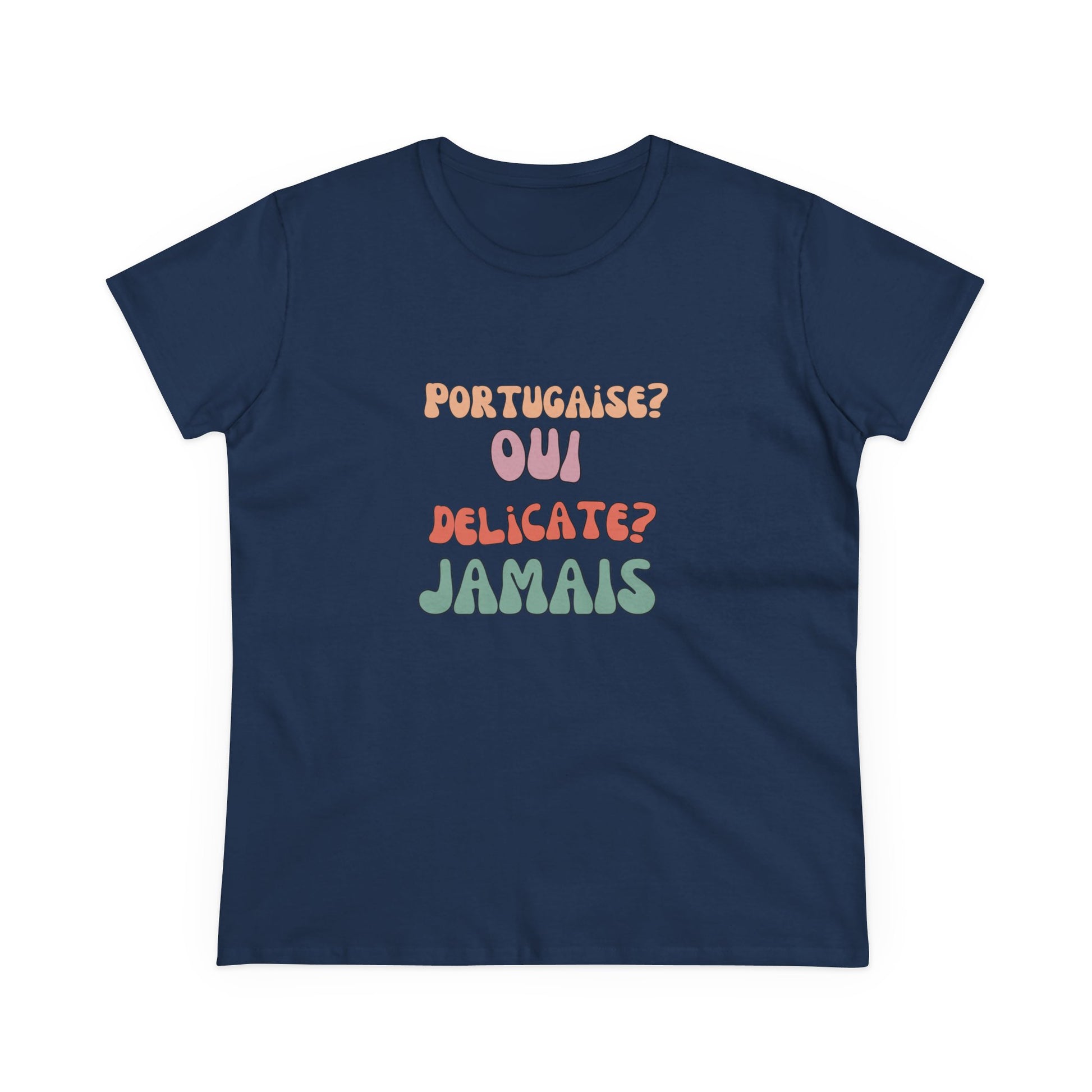 ✨ Uma t-shirt com tanta personalidade quanto quem a veste! Esta peça é dedicada a todas as portuguesas que dizem "oui" com charme, mas "jamais" com atitude. Um design divertido e confiante para usar com orgulho, ideal para momentos casuais ou para surpreender com uma boa dose de estilo franco-português.